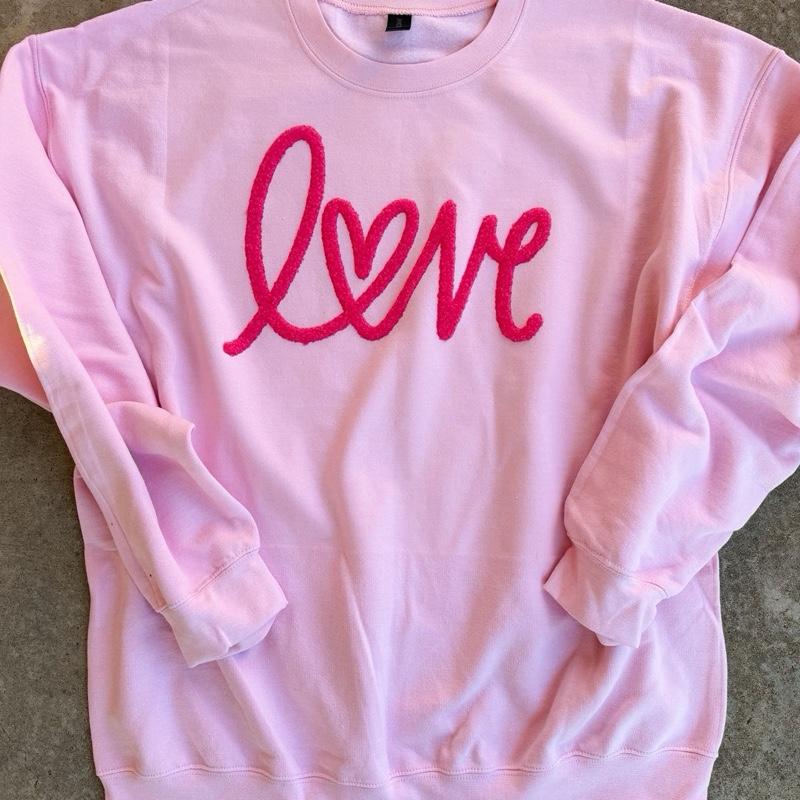 Shop our cozy Valentines LOVE Fluffy Chenille Sweatshirt for ultimate comfort. Perfect for gifting or lounging!