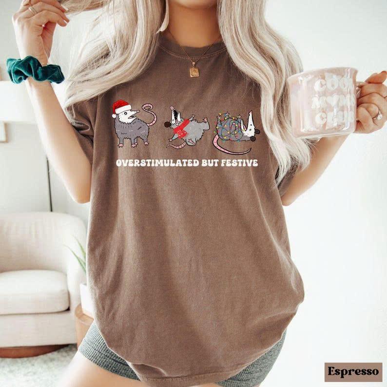 Comfort Colors Overstimulated But Festive Possum Christmas Shirt, Gender-inclusive Designs For Men And Women, Find Your Perfect Size, From Casual To Formal Styles, Casual Yet Stylish Attire, Assorted Colors