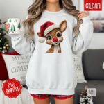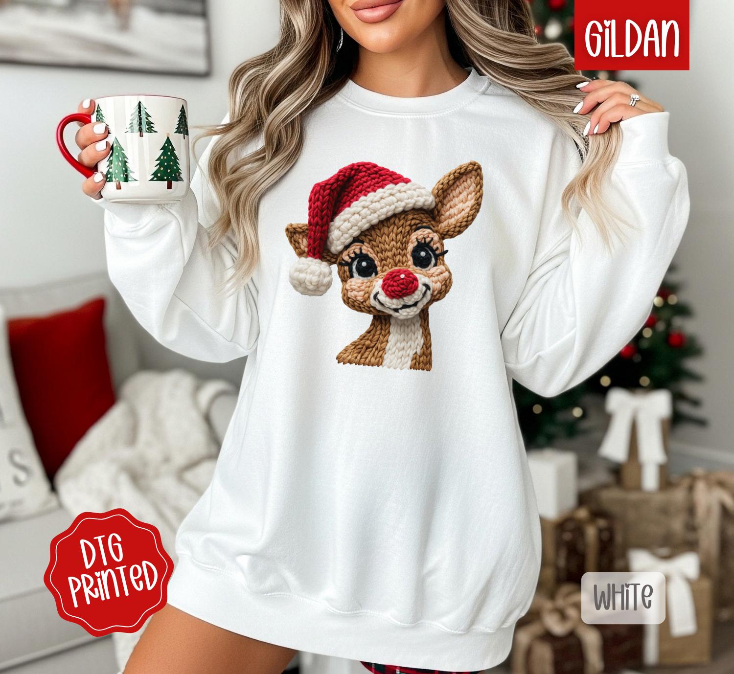 Faux Crochet Rudolph Sweatshirt, Trendy Women’s Christmas Crewneck
