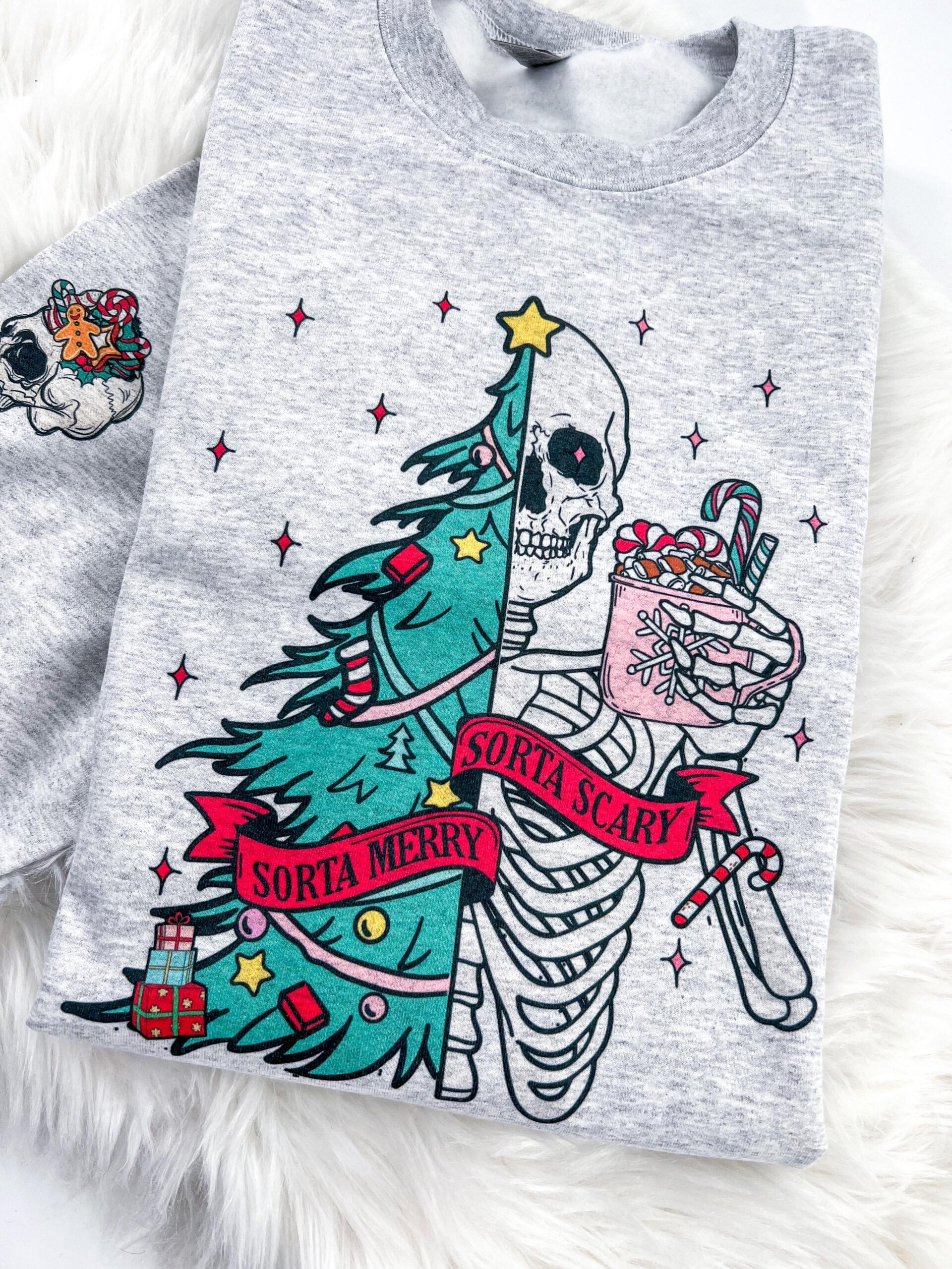 Shop the Sorta Merry Sorta Scary Skeleton Christmas Sweatshirt for ultimate comfort and unique style. Perfect for the festive season!