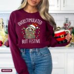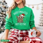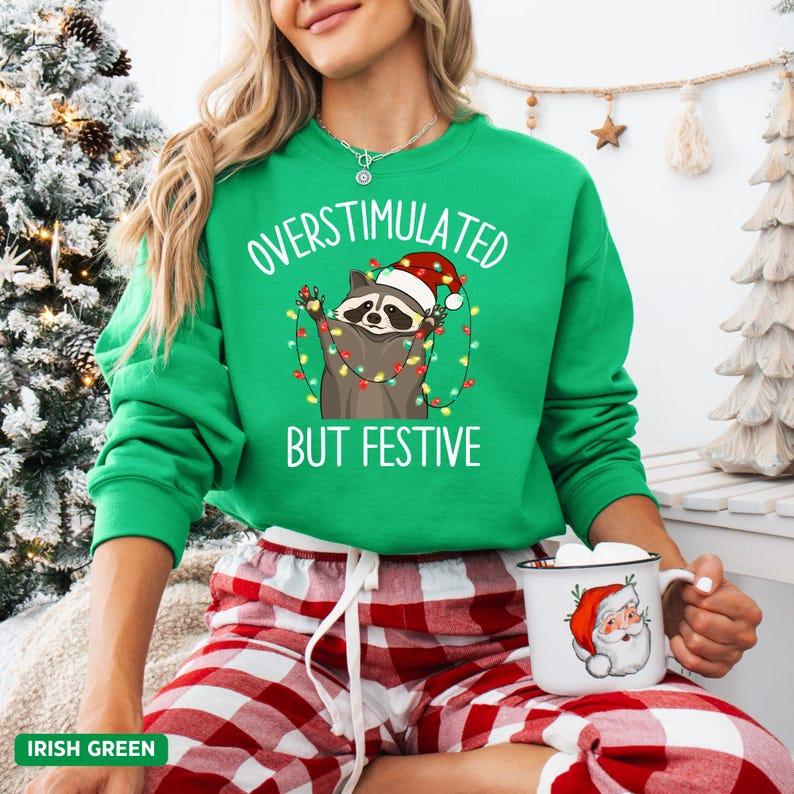 Discover comfort and style with the Overstimulated But Festive Racoon Christmas Sweatshirt. Perfect for all your festive occasions!