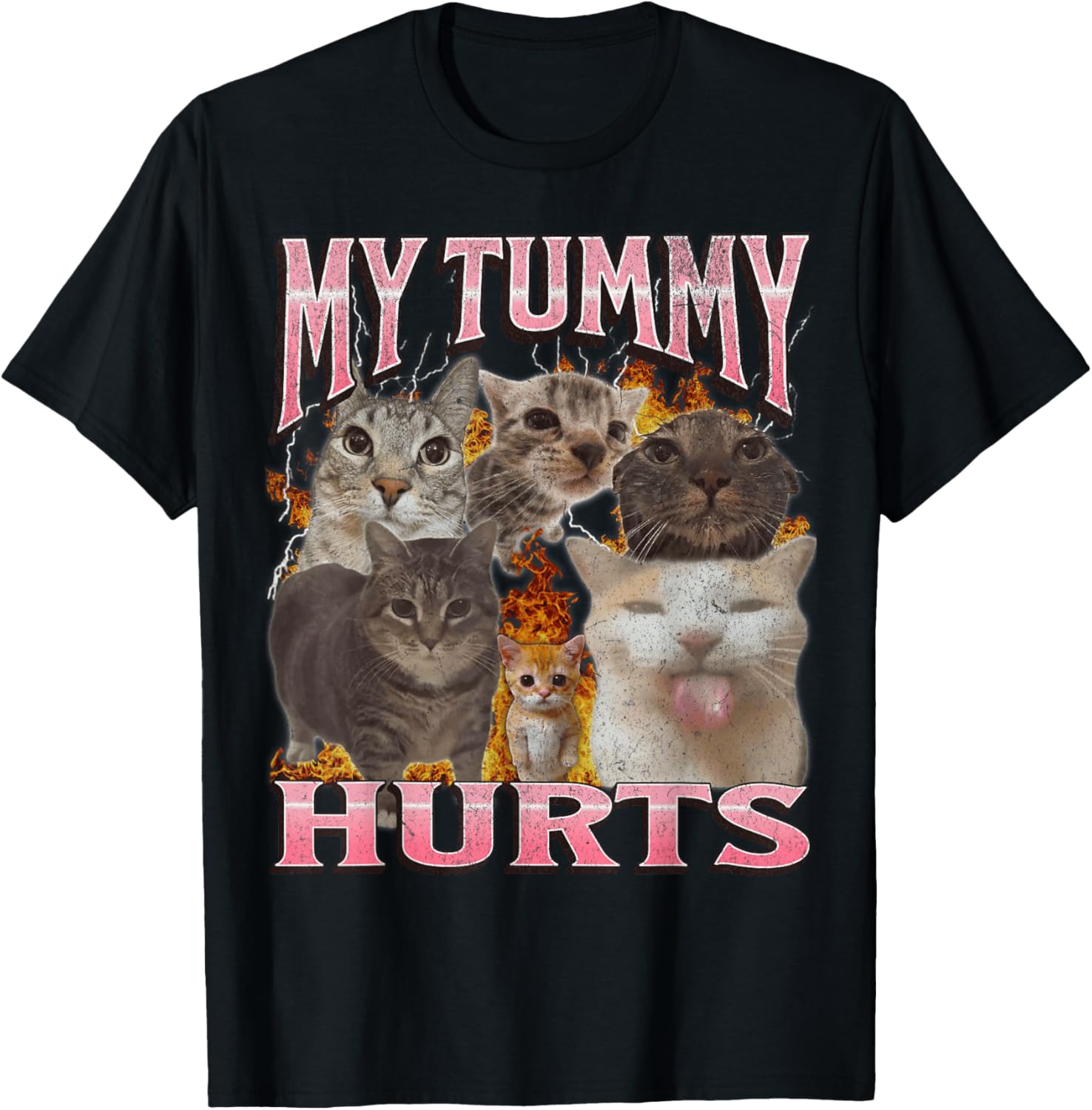 Funny Cat Meme “My Tummy Hurts” T-Shirt – Bootleg Graphic Cotton Tee, Casual Streetwear Style